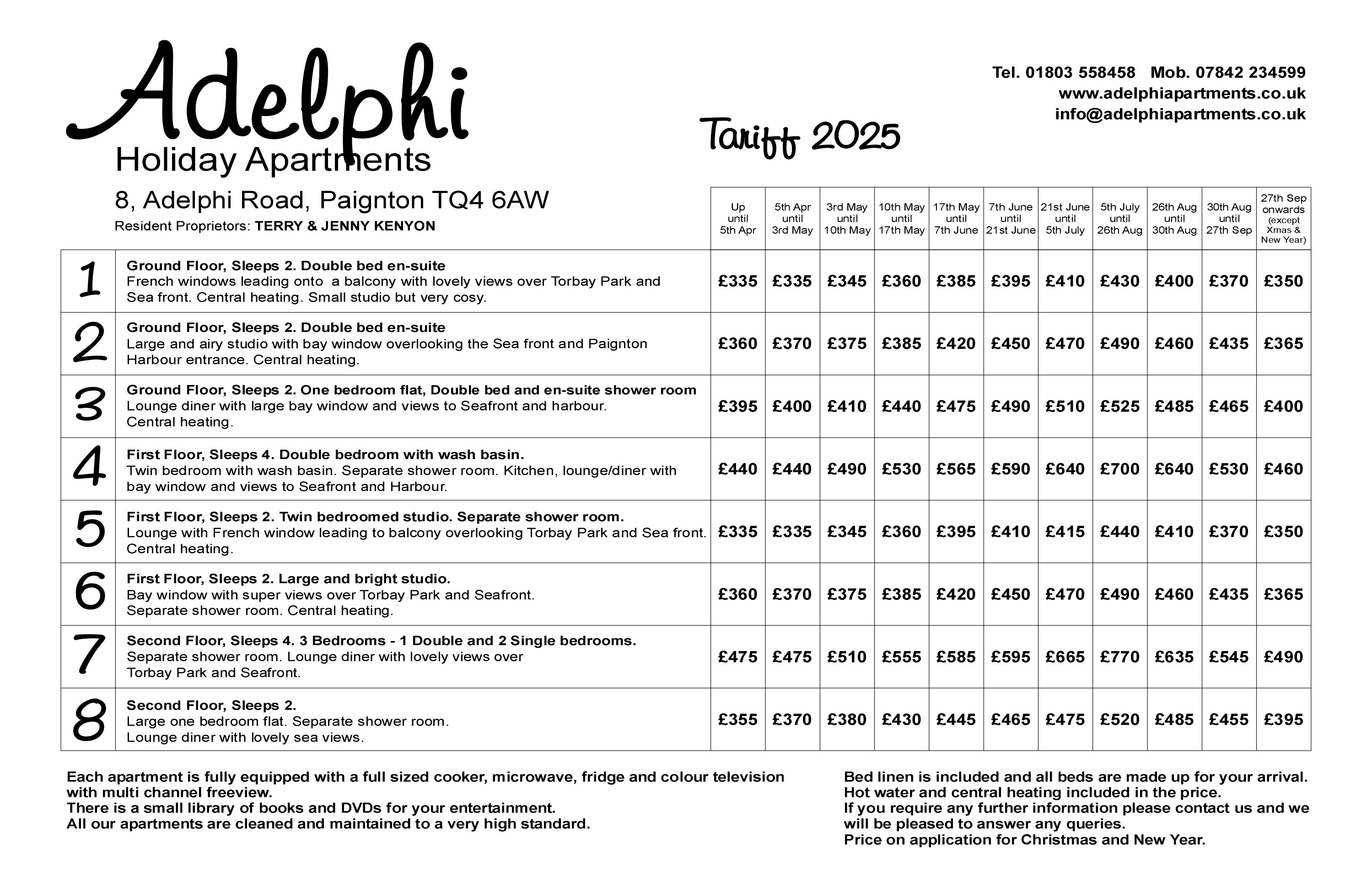 For our best prices and to check availability please phone Adelphi Holiday Apartments on 01803 558458